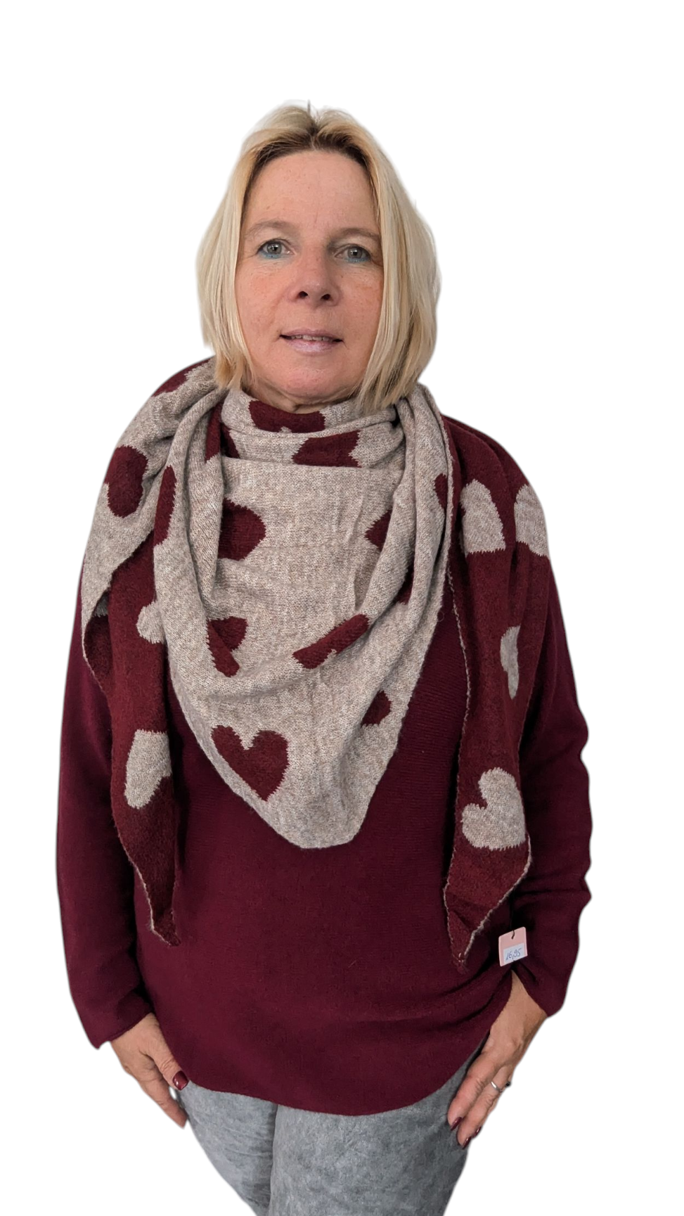 Dreieckstuch weinrot / beige meliert aus reiner Viskose mit praktischem Wendeprinzip – zwei Designs in einem Accessoire. Die weiche, fließende Viskosefaser schmiegt sich angenehm an und bietet maximalen Tragekomfort.