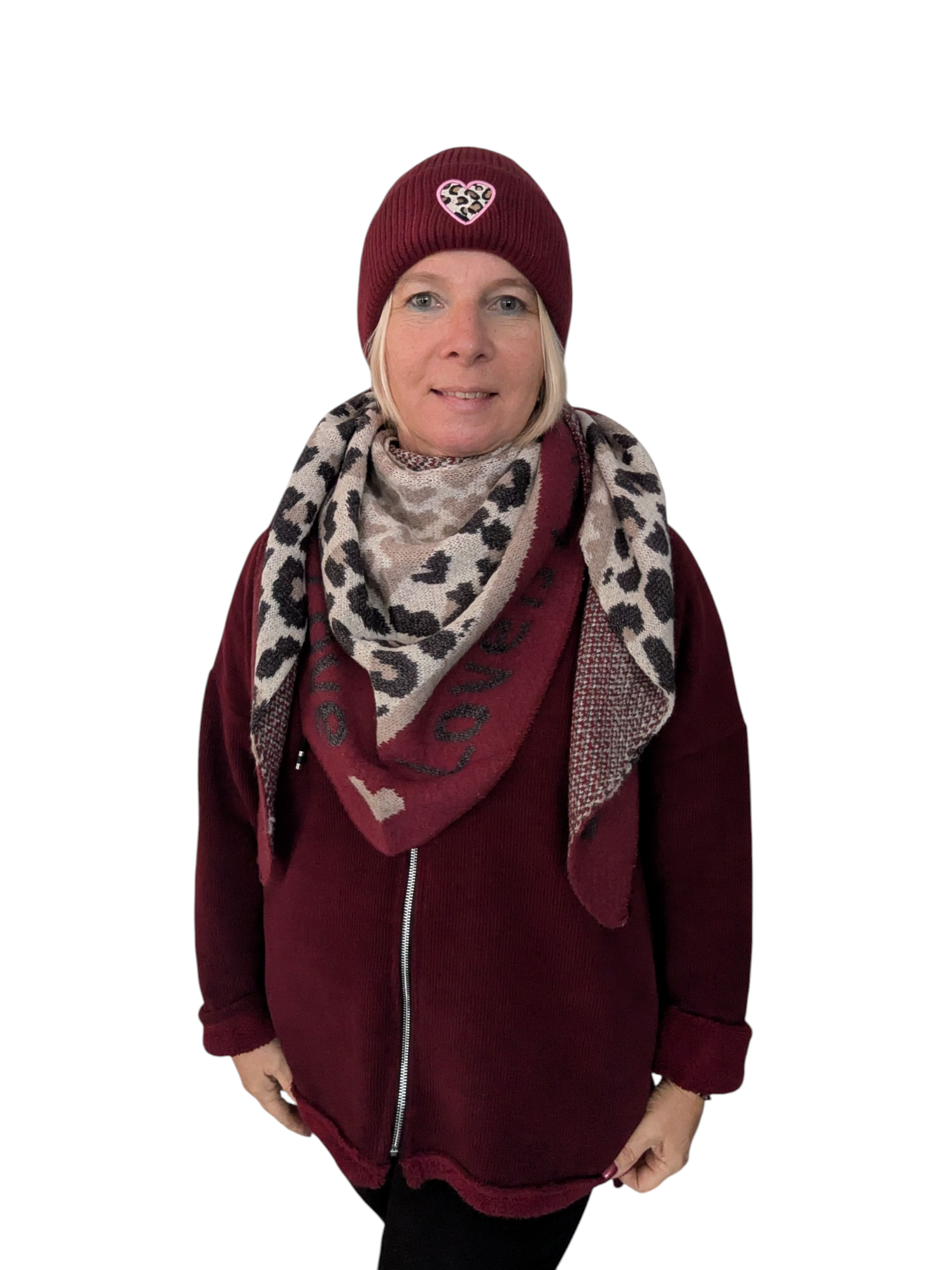 Dreieckstuch weinrot gemustert. Die weiche, fließende Viskosefaser schmiegt sich angenehm an und bietet maximalen Tragekomfort.