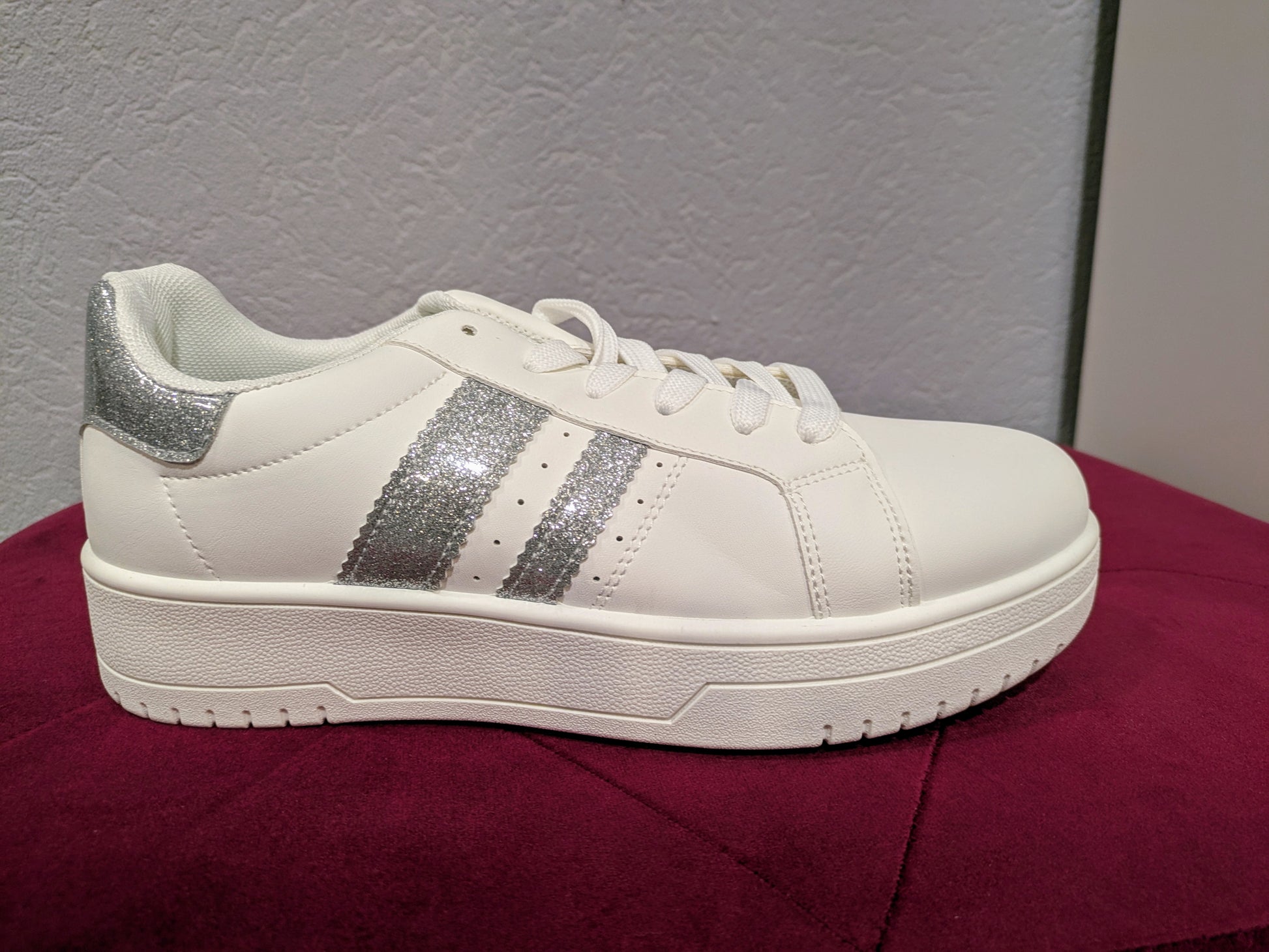 Diese weißen Sneaker überzeugen durch ihr zeitloses Design mit silbernen Streifen, die dezenten Glanz und Stil verleihen.